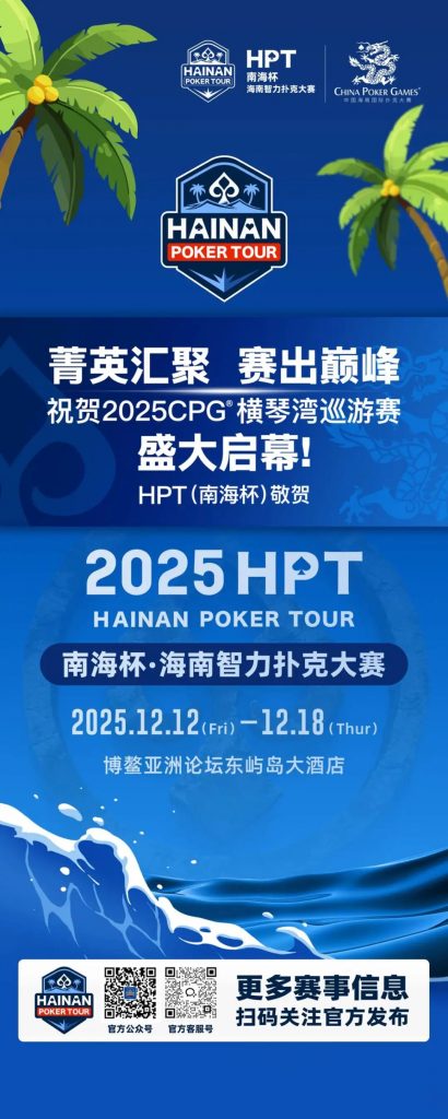 10月18日,2025CPG®横琴湾巡游赛在珠海长隆横琴湾酒店正式启航,海风作序,牌局开场。HPT赛事送上诚挚祝贺,并同步推出「打卡HPT · 锁定12月惊喜」限时福利,与全国牌手共同点燃这场融合竞技魅力与海湾风情的扑克盛会。